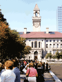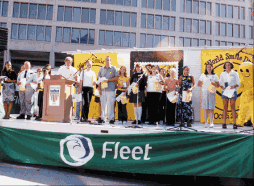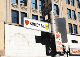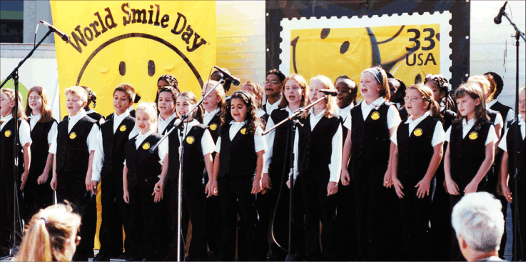 Sam」氏の指導で皆で挑戦した路上ペインティングは、多くの参加者を得て会場を盛り上げ、「ワールド・スマイル・デイ」を盛り上げるのに充分なものであった。 しかしやはり主役は子供達であり、「スマイリー・フェイス」のマークを掲げ、新しい時代の到来を誓い合った。多くのウスター市の市民の誇りはやはり「ハーベイ・ボール」氏であり、この「スマイリー・フェイス」は町のシンボルとなり、永遠に引き継がれることを市長が宣言した。 過去2回の「ワールド・スマル・デイ」は大成功であった。 「ワールド・スマイル・デイ」の活動は最近の暗い世相を吹き飛ばす為に最も重要なイベントになりつつある。今ほど世界の人々が「スマイル」(微笑)を必要とする時代はない | |