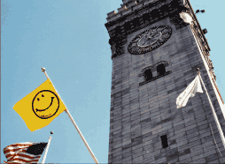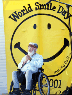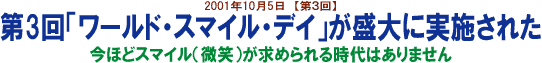 【第3回目】 「ワールド・スマイル・デイ」ももう3年目を迎えた。2001年は特に「スマイリー・フェイス」の生みの親である「ハーベイ・ボール」氏が死去された年であり、地元マサチューセッツ州ウスター市では市をあげてこの行事が計画され、地元ウスター市では彼は「聖人」の域に達したと言われている。 街中が「スマイリー」一色になり、シティホールの前に「スマイリー・フェイス」の旗が掲げられ、通りには「スマイリー・ストリート」の看板が立ち、マサチューセッツ州及び全米各地から多くの人が参加する事となった。会場には多くのウスター市の市民が駆けつけ、「ハーベイ・ボール」氏の死を悲しんだ。当日は2000人以上の参加者があり、「ハーベイ・ボール・スマイル大賞」の授与式も行われた。5大学の学生による「アカペラ・コーラス」は「スマイリー・フェイス」誕生の良きアメリカを歌い上げたもので、多くの市民の郷愁を誘った。又ボストンから招いた壁画家「Sidewalk